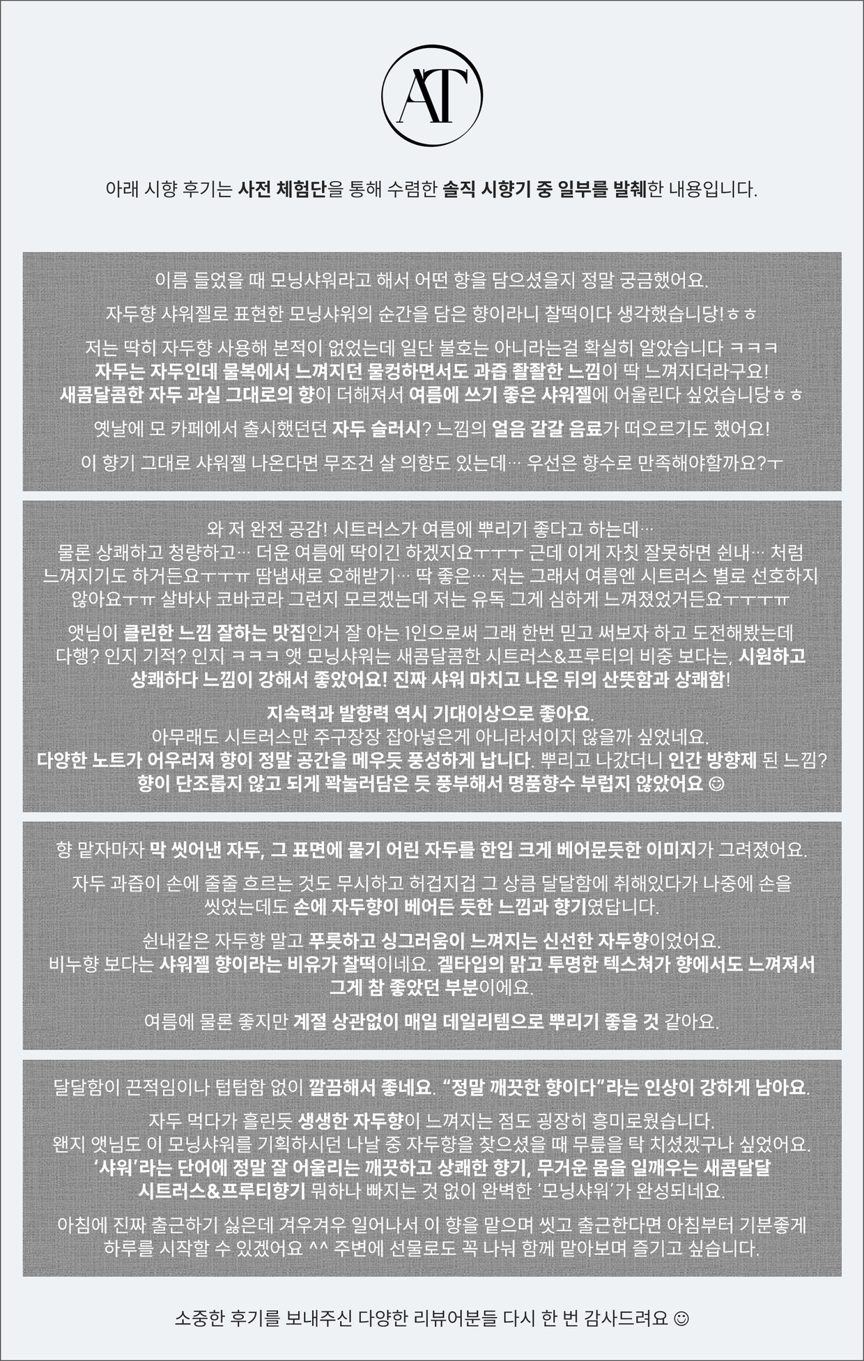 아침 샤워시간을 표현하고는 싶은데 흔한 시트러스는 싫고